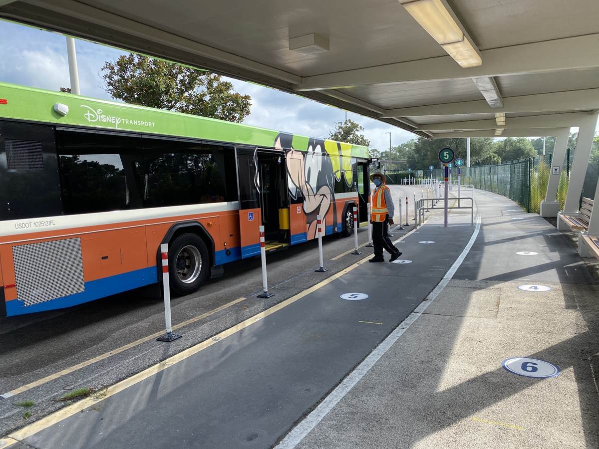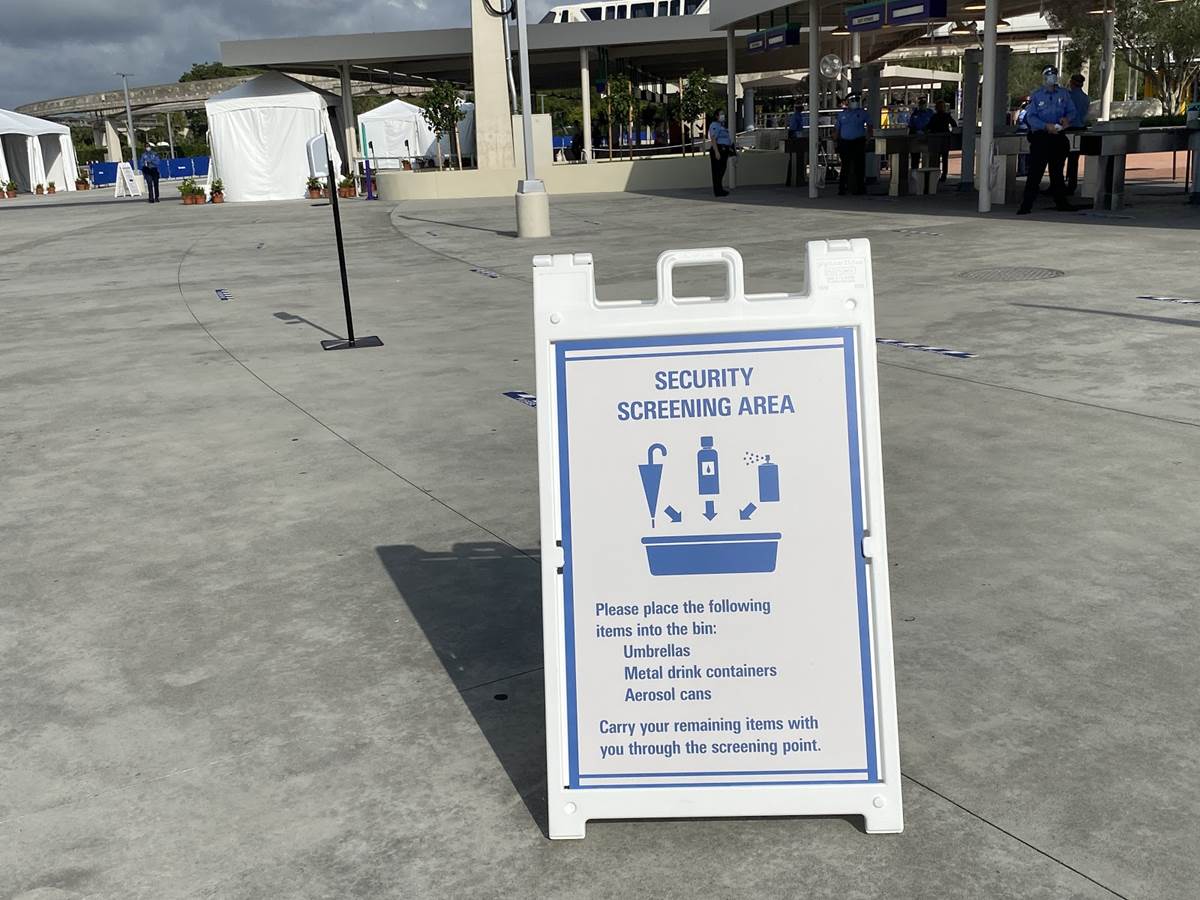 Guests go through a temperature screening and touchless security check at the Transportation & Ticket Center before choosing their mode of transportation across or around the Seven Seas Lagoon.