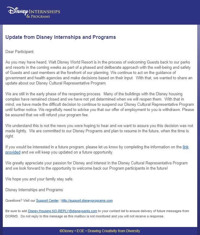 - As with the College Program cancellation, Disney alerted Cultural Representative Cast Members that the previous offer of employment is now withdrawn.