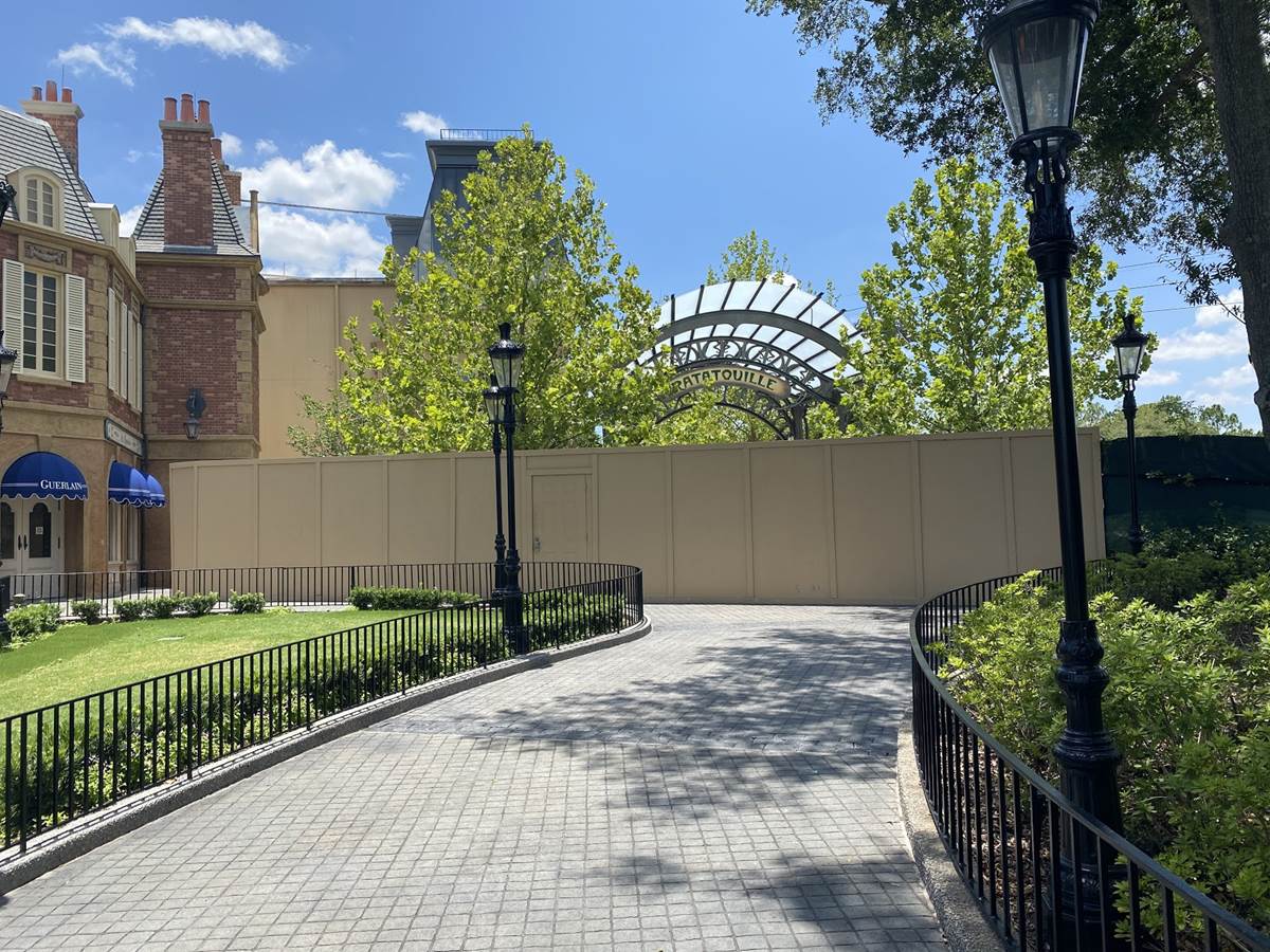 The entrance to Remy’s Ratatouille Adventure is also visible behind a rare unthemed construction wall.