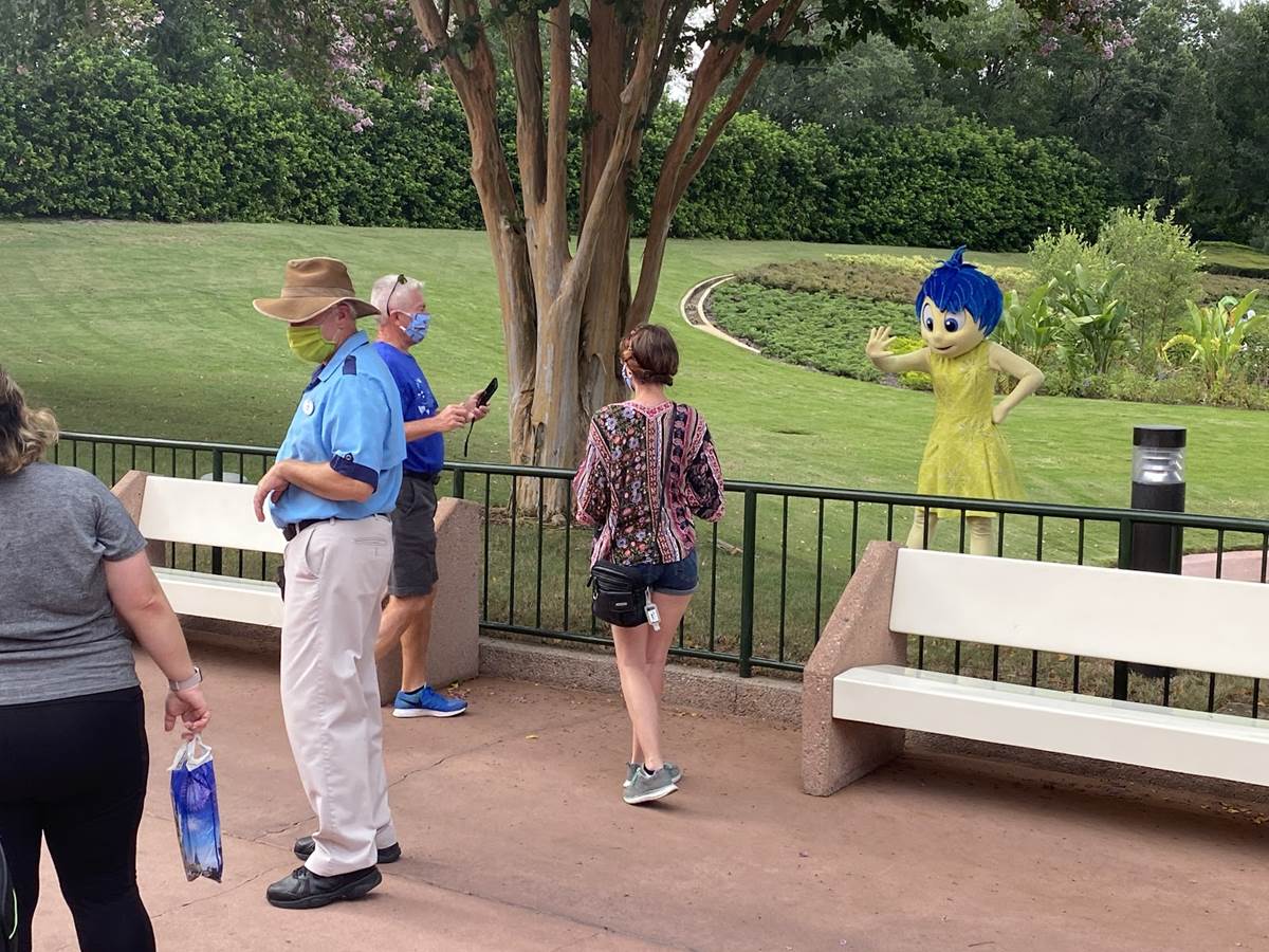 Characters are still part of the EPCOT experience, with parade cars traveling through World Showcase in addition to some characters who appear behind a social distancing barrier.