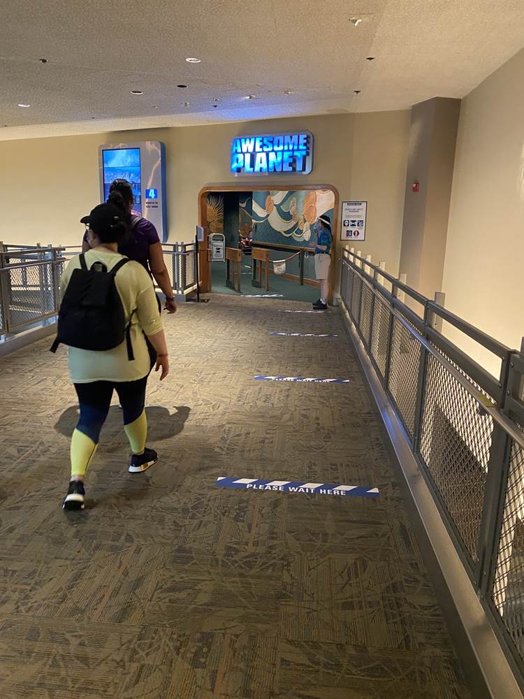 One of EPCOT’s newest attractions, Awesome Planet, includes a social distance queue through the wall carpet holding area.
