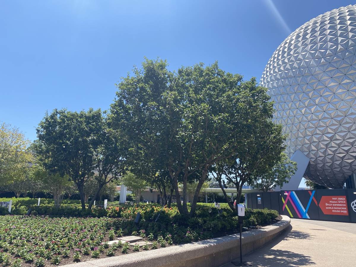 One of EPCOT’s relaxation zones is between Mission: Space and Test Track in an outdoor area.