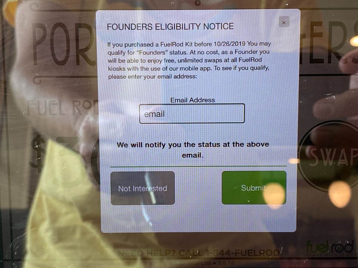 - Once verified, Founders will use the FuelRod app in conjunction with the kiosks to obtain free swaps under the program.