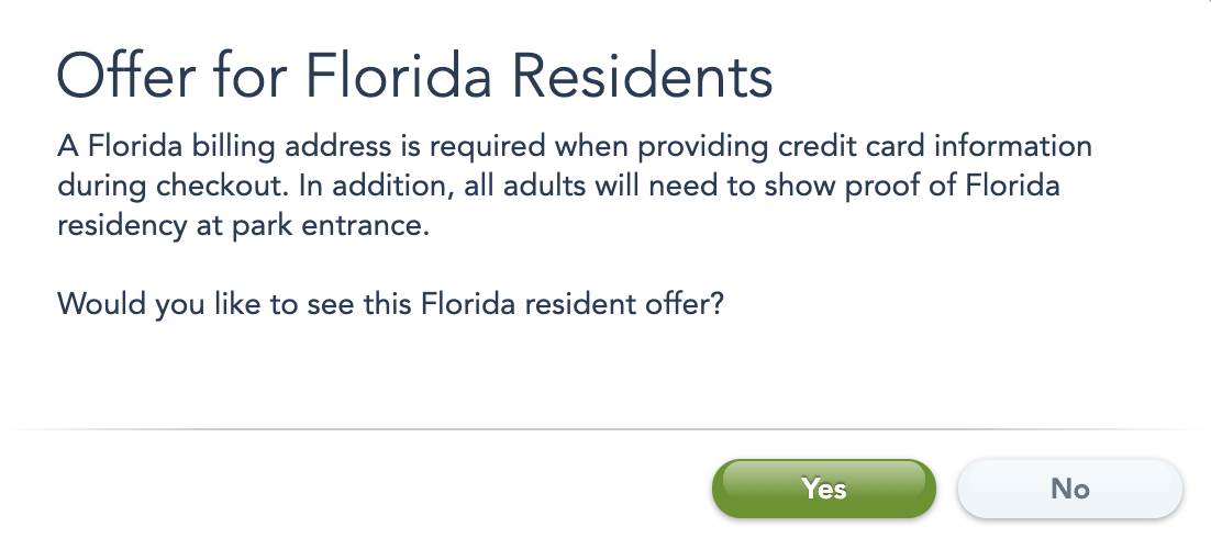 - Please note, guests wanting to take advantage of this offer must have a Florida billing address and be able to show proof for Florida residency at park entrance.