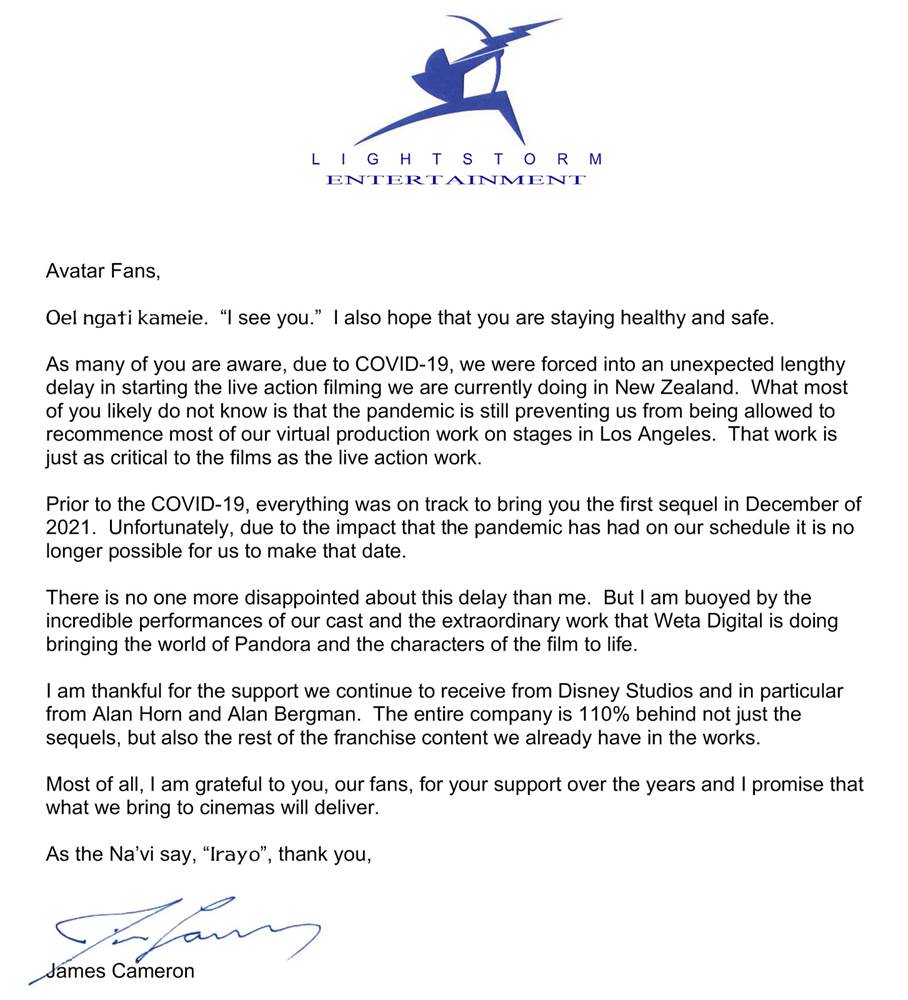 Additionally, director James Cameron address the delays on Twitter sharing a personal note to fans: