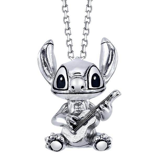 “Sculpted in solid sterling silver, adorable Stitch plays his ukulele! Antiqued for detail, the weighty three-dimensional pendant hangs from a sterling silver adjustable cable chain. Chain = 18 inch + 2 inch extender (20 inch overall).”