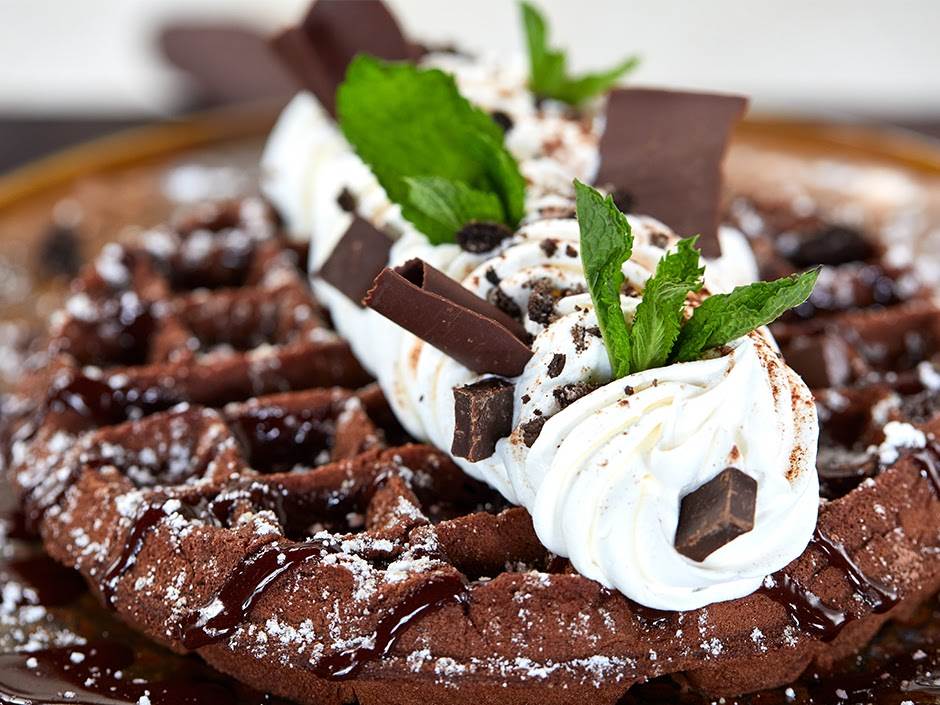 - Chocolate batter waffle topped with chocolate chunks, white whipped cream, chocolate raspberry sauce, chocolate shavings, powdered sugar and micro mint