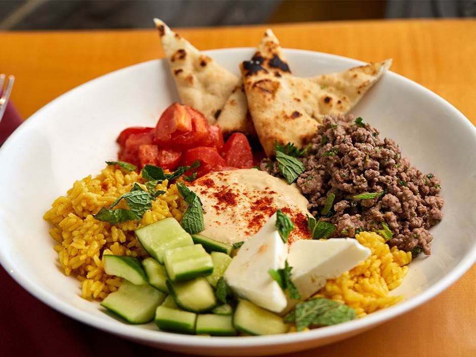 - Spiced ground lamb, house-made hummus, turmeric rice, tomato, cucumber, feta and charred pita.