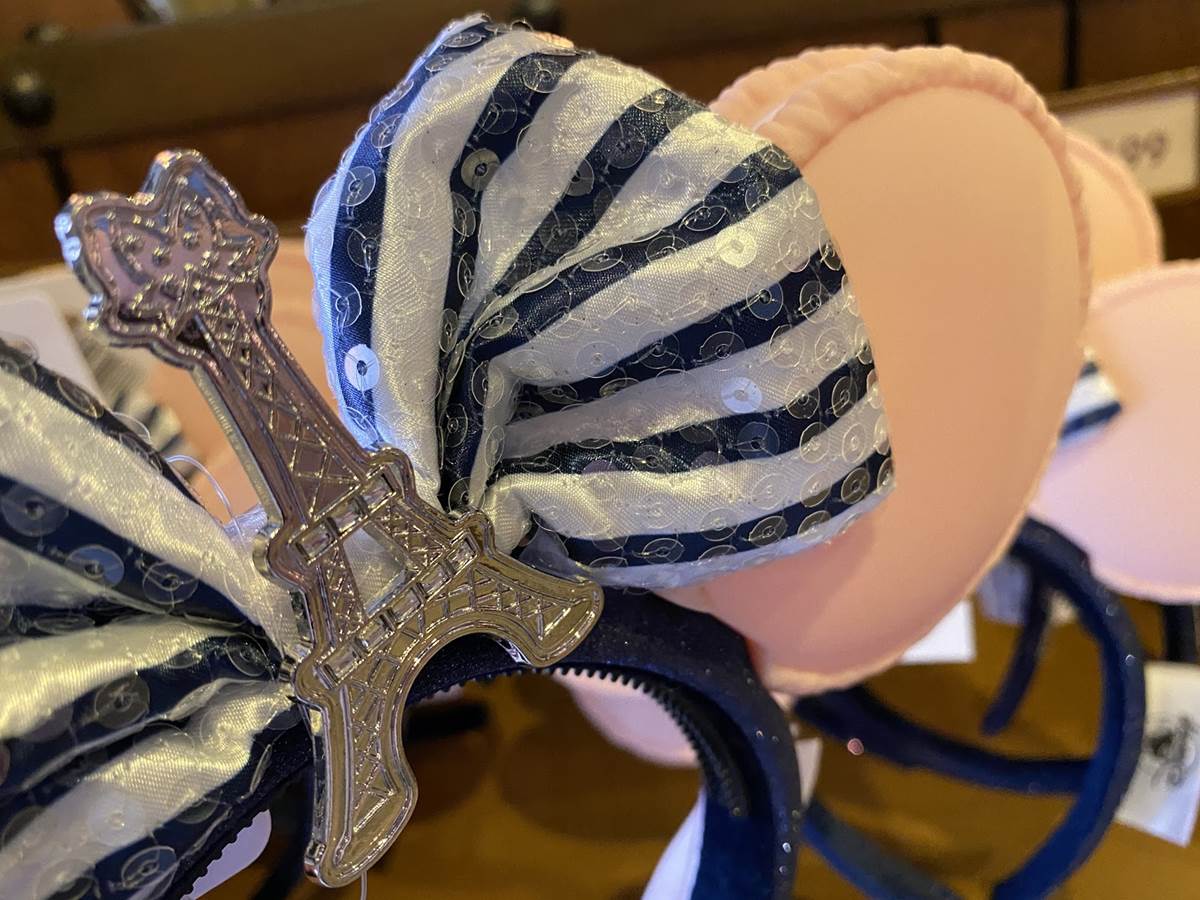 Love Paris but don’t want Macarons all over everything? Another pair of mouse ears features the metallic Eiffel Tower at the center of a bow with a pattern that evokes images of Paris, also featured on the Spirit Jersey below. The ears feature a pattern of navy and silver sequins for $29.99.