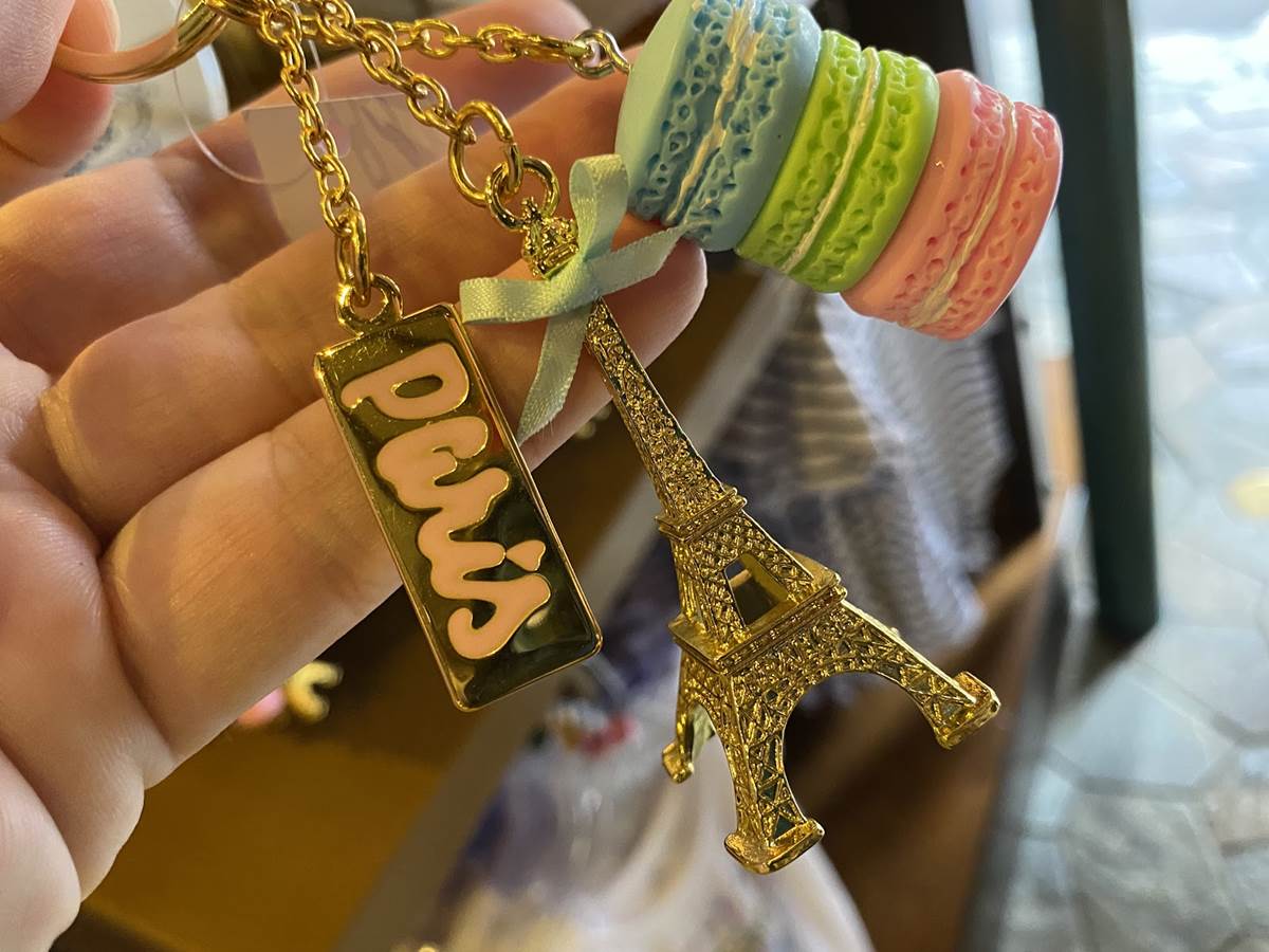 Complete the look with this Paris keychain that includes a stack of macaron cookies and the Eiffel Tower for $9.99.