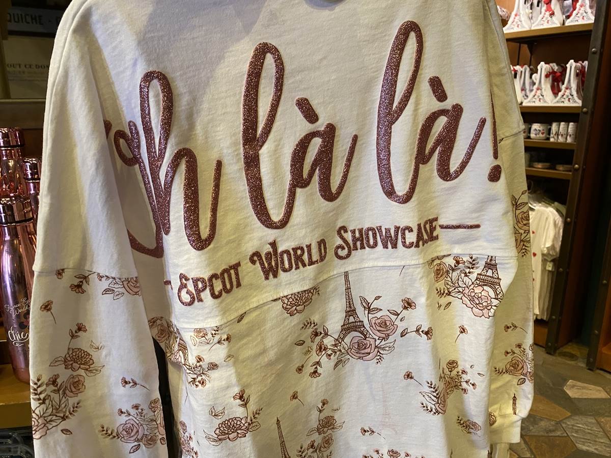 Not that into Spirit Jerseys? No worries, you can still look fabulous in this classic t-shirt that shows Minnie walking a poodle which also says “Oh la la!” This shirt retails for $29.99.