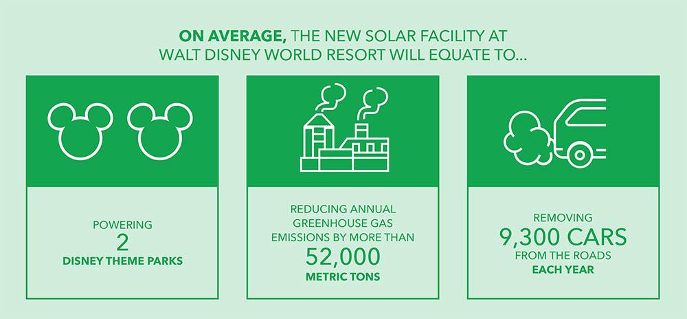 - The new solar facility is capable of powering two Disney theme parks, which will reduce annual greenhouse gas emissions by more than 52,000 metric tons.