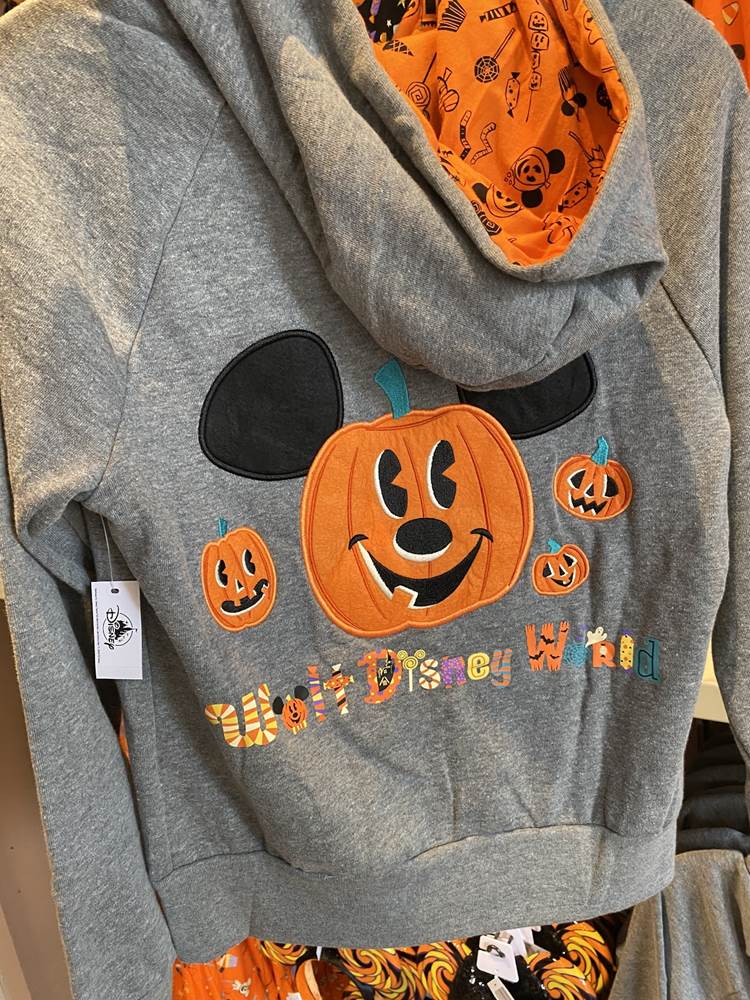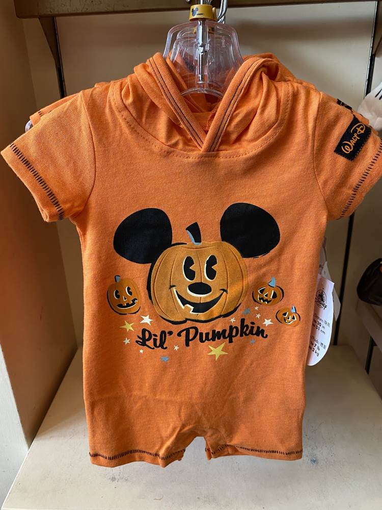 We start off with a bright onesie for those “Lil’ pumpkins” out there, featuring a giant Mickey jack-o-lantern, similar to what sits at the end of Main Street USA this time of year at DIsneyland, but here on merchandise at Walt Disney World. The onesie sells for $24.99.