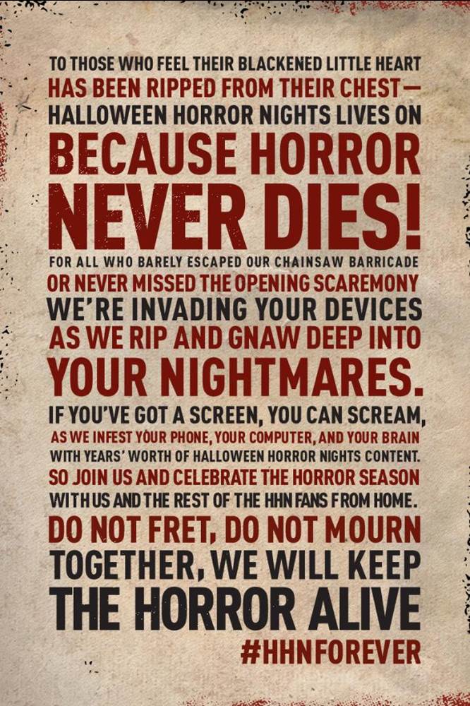 - Universal hasn’t shared any additional details yet about the virtual experience, but fans can join in the fun on social media by using #HHNForever.