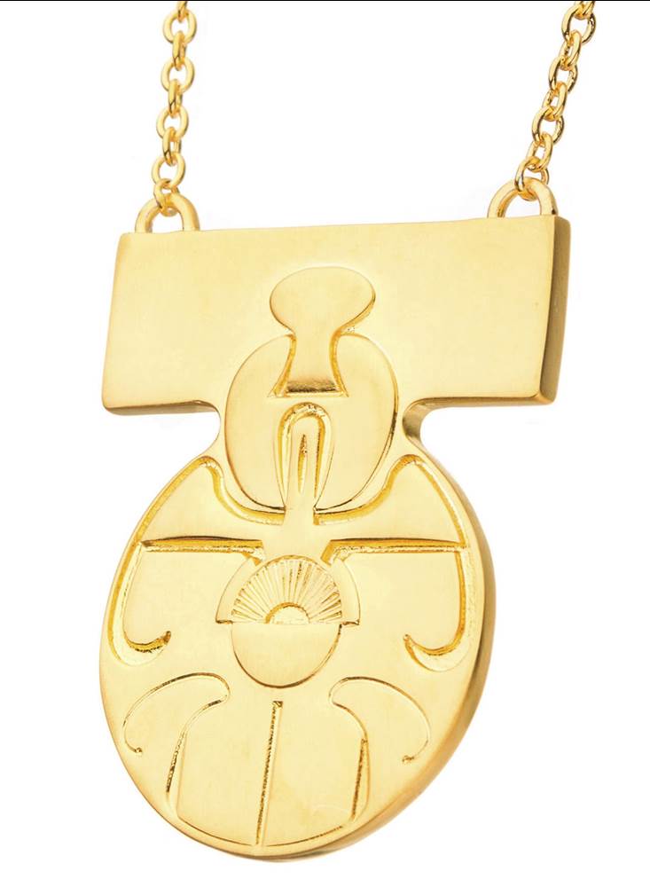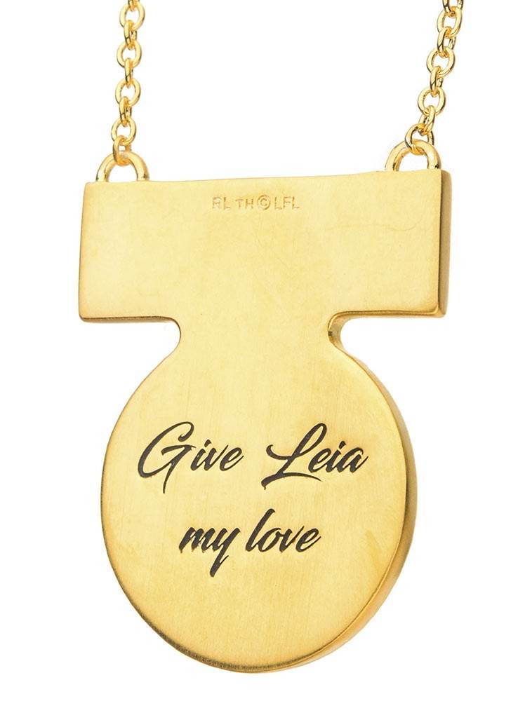 - The pendant is sculpted in solid artisan brass and plated in satin-finished yellow gold and is inscribed on the back with the phrase, “Give Leia my love.”