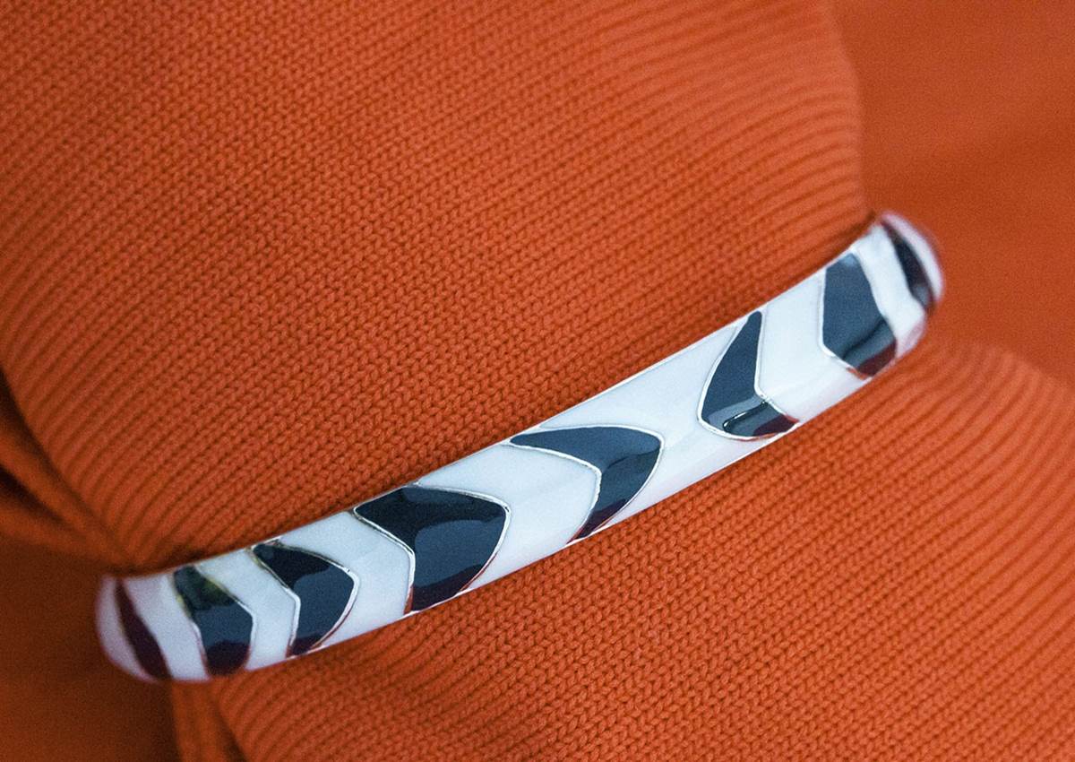 - The second piece is a modern art-inspired medallion handcrafted in solid sterling silver and then filled with vibrant grey-blue, orange, and white hand-painted premium enamel.