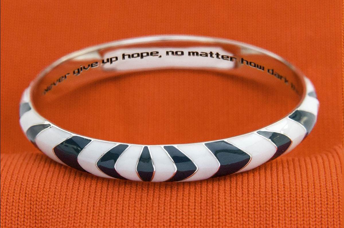 - The inside of the band is inscribed with the quote “Never give up hope, no matter how dark things seem.”