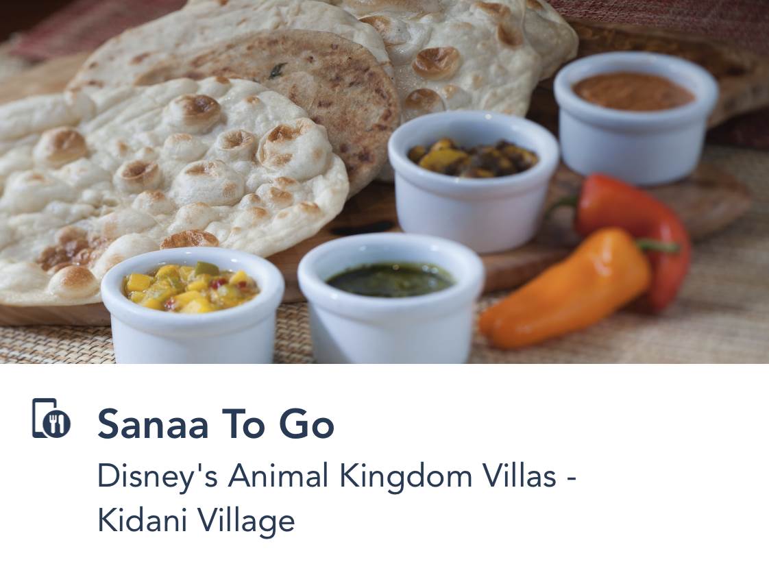 - Sanaa’s To Go menu includes all of the restaurant’s menu items, including the famous Indian-style Bread Service, used in the image for the restaurant in the My Disney Experience app.