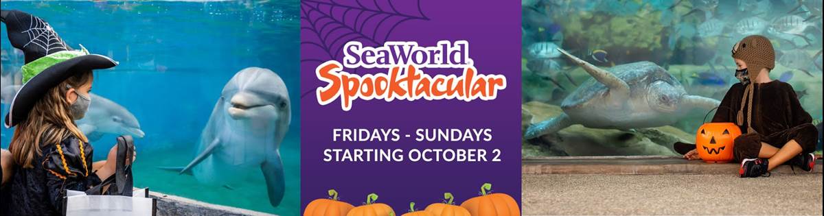 - SeaWorld San Diego’s Spooktacular returns Fridays, Saturdays, and Sundays from October 2nd through November 1st. and includes pumpkin scavenger hunts, a candy trail with a safe trick-or-treating experience, cookie decorating with furry friends, and a dance party.