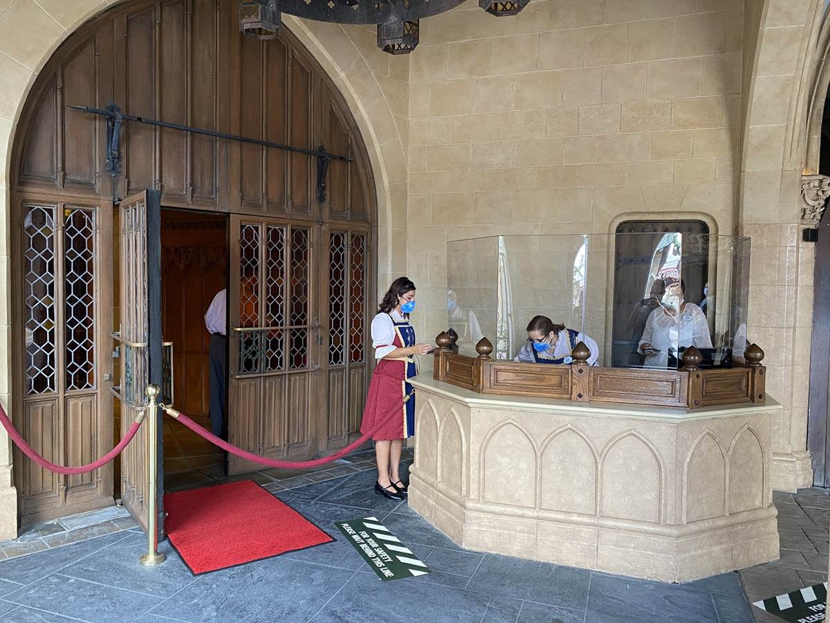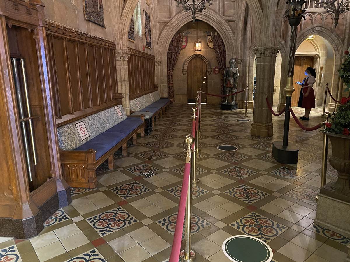 To get to the elevated dining hall, Guests historically waited in an area downstairs for their name to be called. That area has been modified to enforce social distancing requirements, with seating areas unavailable and dots on the ground where parties should wait to be called up. Cast Members with radios stand at either end to make sure that only one group is going up or down at any given time to prevent them from coming within 6-feet of each other and Cast Members routinely go up and down to sanitize handrails.