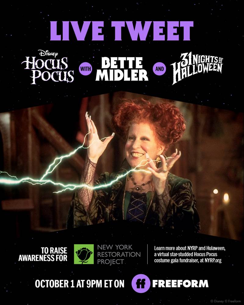 Freeform is kicking off their first night of 31 Nights of Halloween with a tweet-along of Hocus Pocus with Disney Legend Bette Midler tonight (10/1) at 9:00 pm ET.