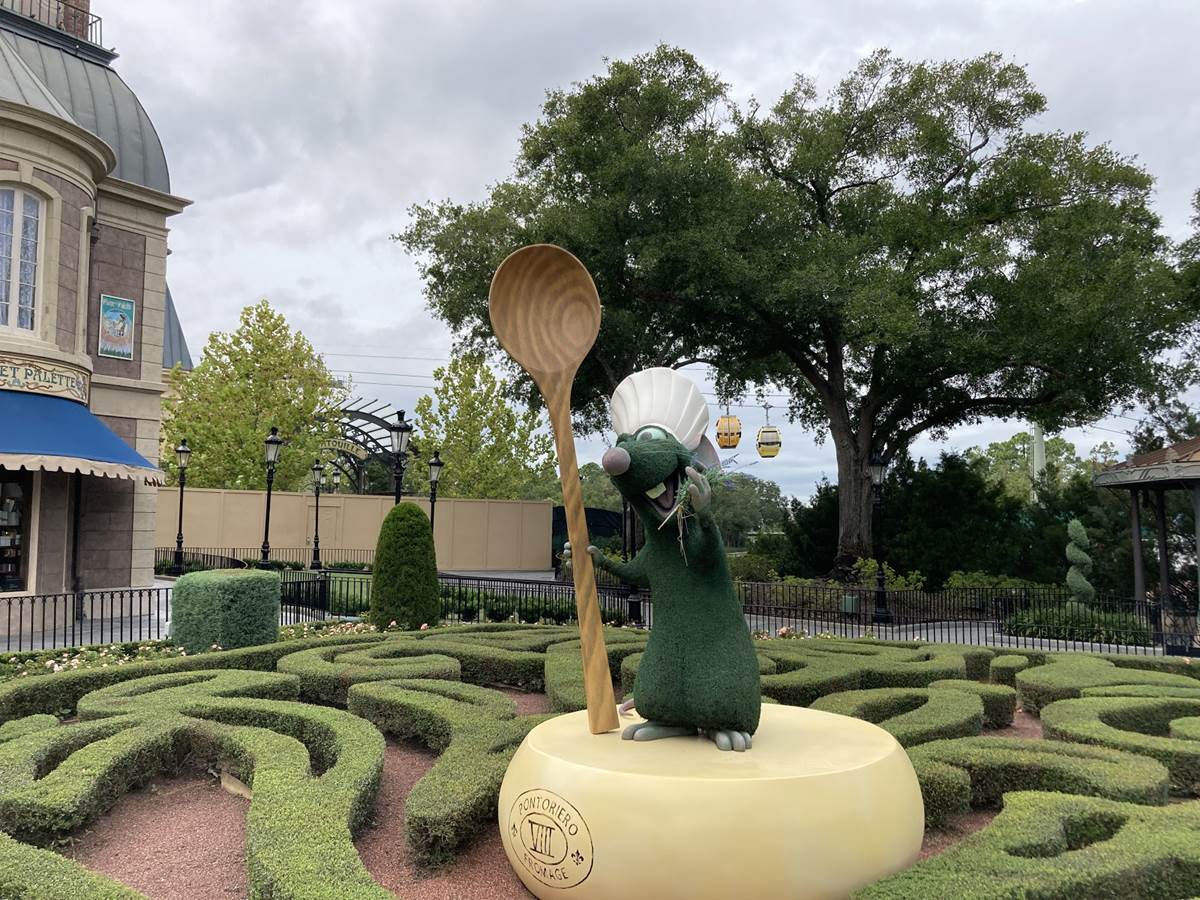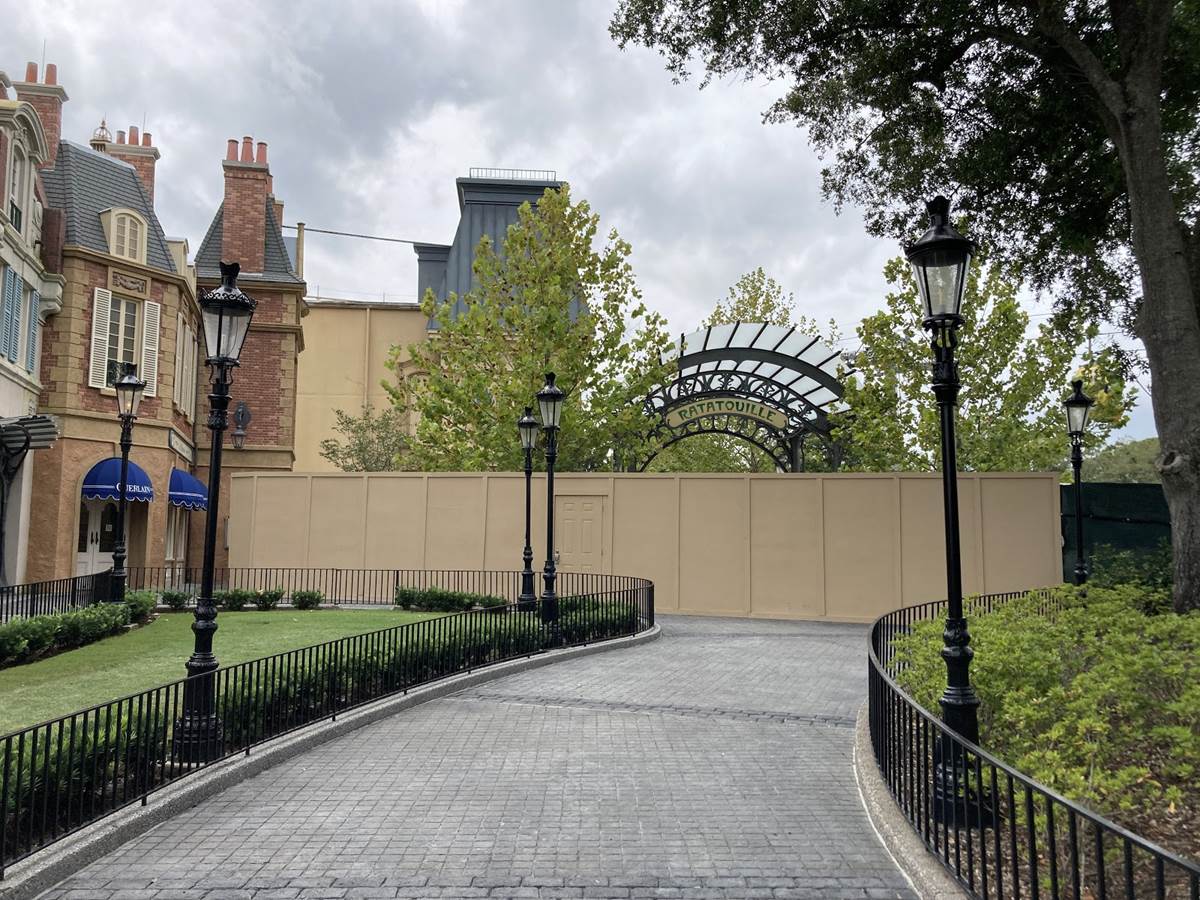 Progress on this highly anticipated attraction is still cooking up in the back corner of the France pavilion. In it, guests will shrink down to the size of a rat and follow Remy and his pals through the kitchen and dining room of the well loved eatery. The big challenge? Avoid getting caught! But not to worry, your journey is bound to end on a sweet note. As evidenced by the photos below, much of the exterior is complete, with work remaining on the inside of the attraction. Many expected this attraction to open earlier this summer, but work continues and we hope we have more information on when we can journey into Gusteau’s kitchen soon.