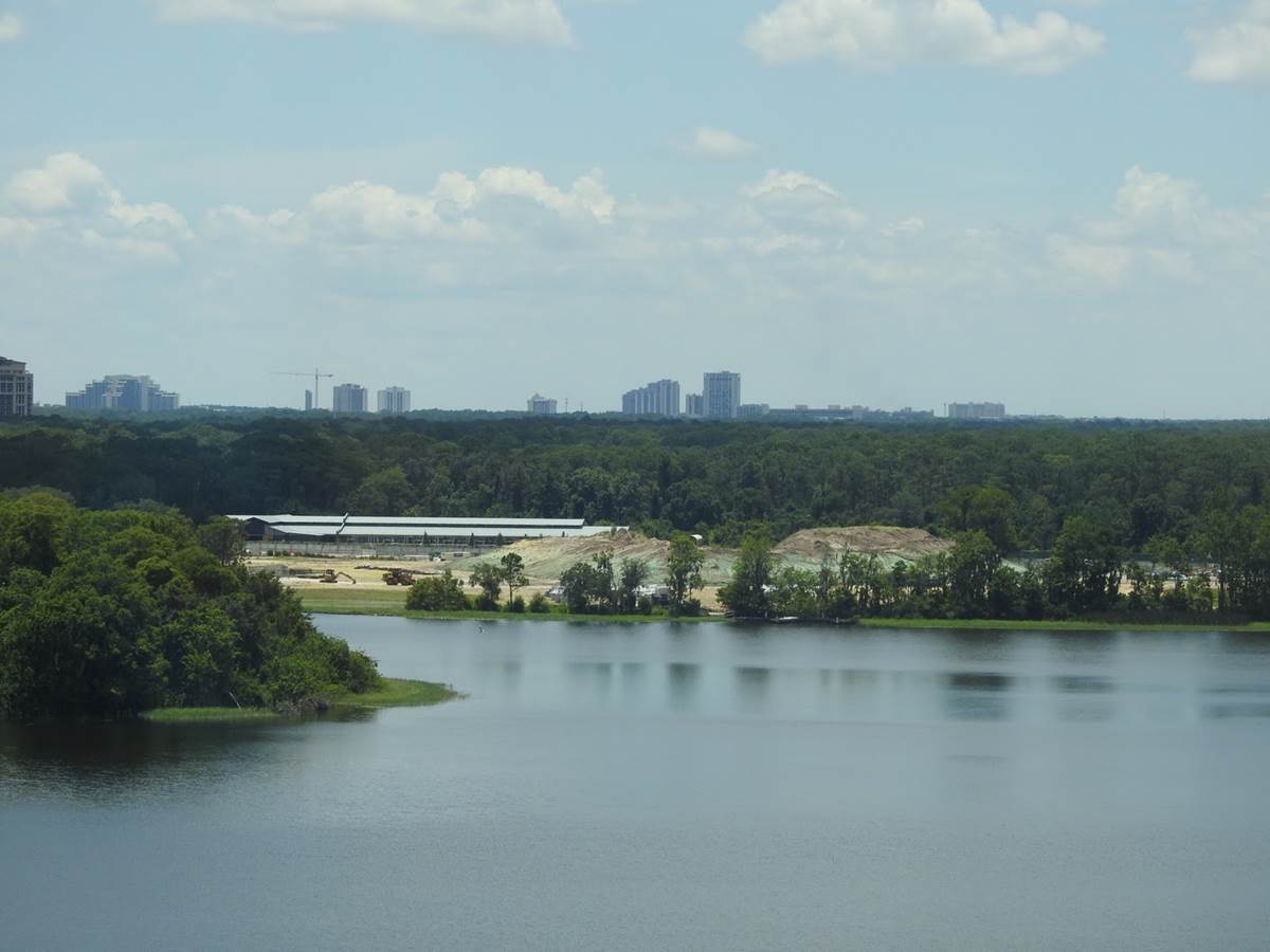 In the above photo, you can see that dirt had been moved around on the former River Country site next to the new Tri-Circle D Ranch, the long building to the left. The above photo was taken from Disney’s Contemporary Resort. Below is a photo of the same area taken from a boat on Bay Lake. You can see the stables through the trees and the mound of dirt looking about the same as it did in June, just with grass growing rather than the previously visible grass seed bed.