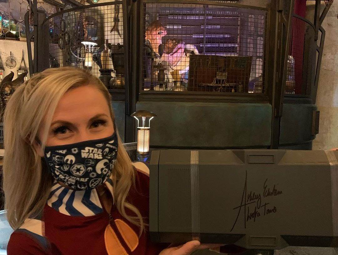 Ashley Eckstein surprised Star Wars fans last night who were holding a Discord lightsaber meetup in Star Wars: Galaxy’s Edge by crashing their party and launching the Ahsoka Tano color changing Legacy Lightsaber with the first several hundred autographed by the Her Universe founder.