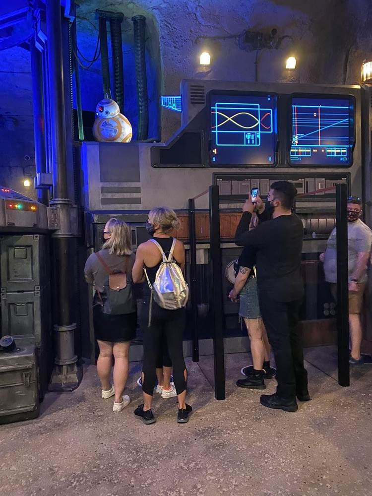 You’ll notice lots of plexiglass dividers in the video above in sections of the queue where Guests have to pass each other. New plexiglass dividers have been added in the briefing room, which allowed Disney to add additional dots on the ground to get more Guests through the experience.