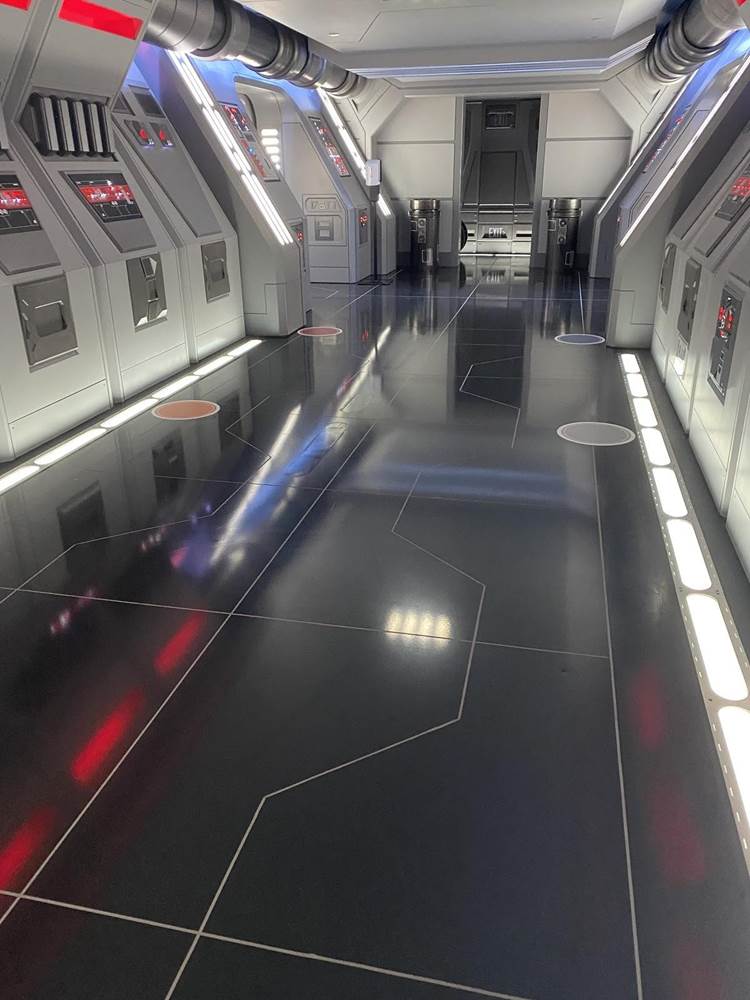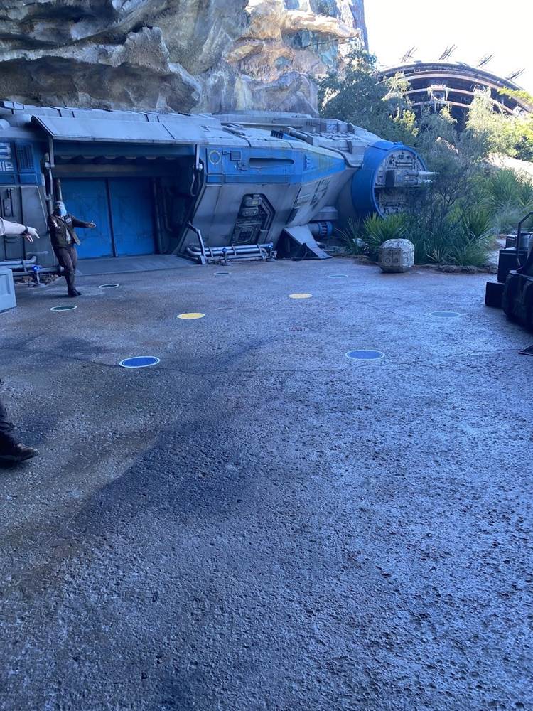 In the outdoor loading area for the Intersystem Transport Ship, colored dots have replaced the previous boarding group numbers that Guests would stand on, spread further apart before boarding the ship.