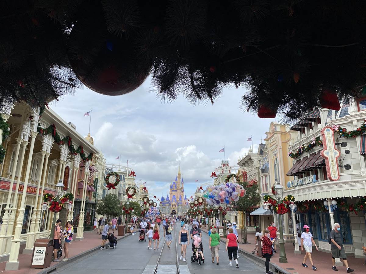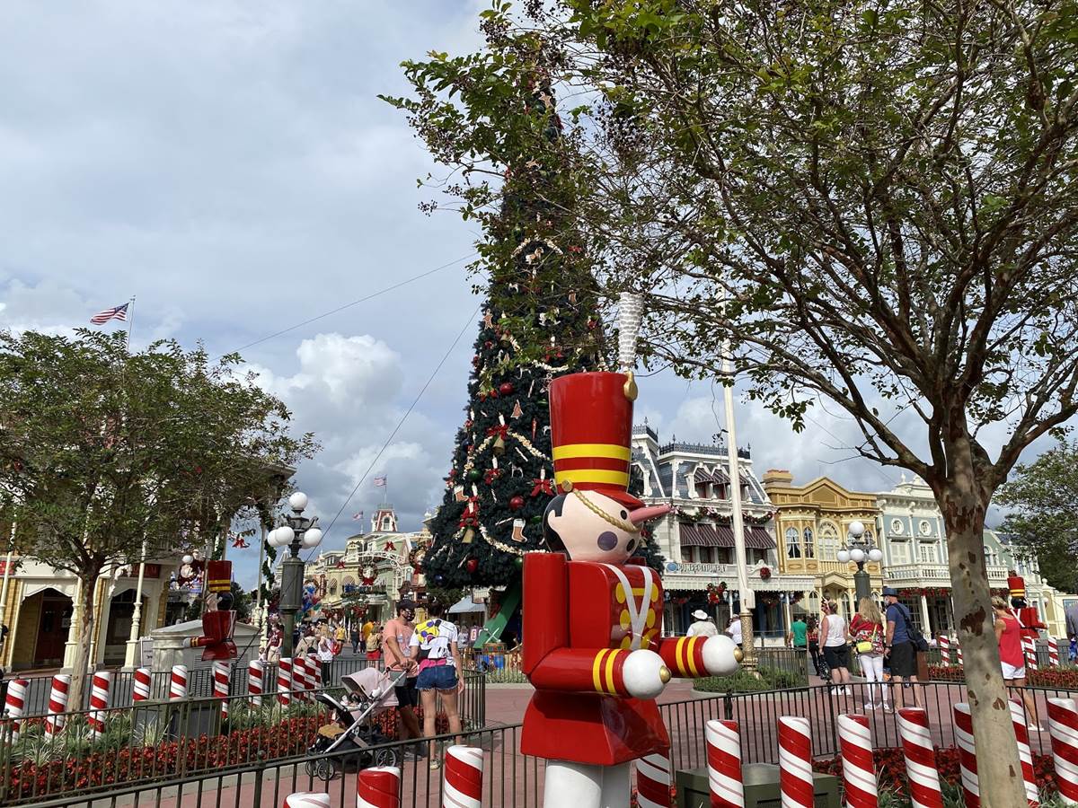 - Once inside the park, guests will of course see the giant Christmas tree right in th middle of Town Square, surrounded by more holiday decorations which lead guests down Main Street, U.S.A.