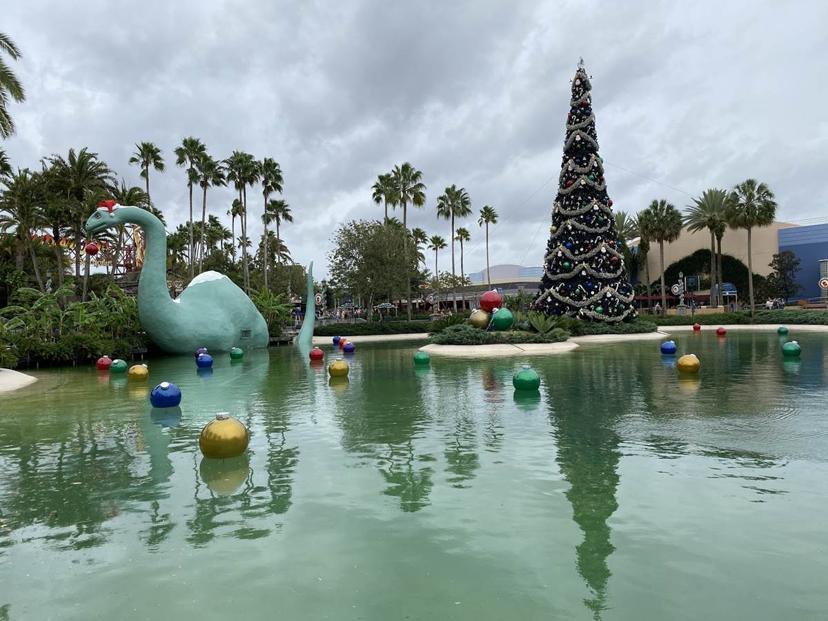 Gertie the dinosaur is in on the festive fun with a Santa hat and a giant ornament hanging out of her mouth with the seaweed she just pulled out of the lake.