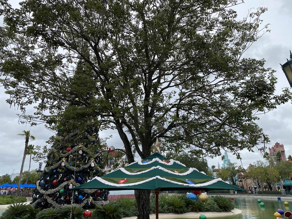 The park’s tall Christmas tree stands at the center of Echo Lake, which is full of floating giant ornaments. Even the umbrellas around the lake have been decorated to look like Christmas trees.