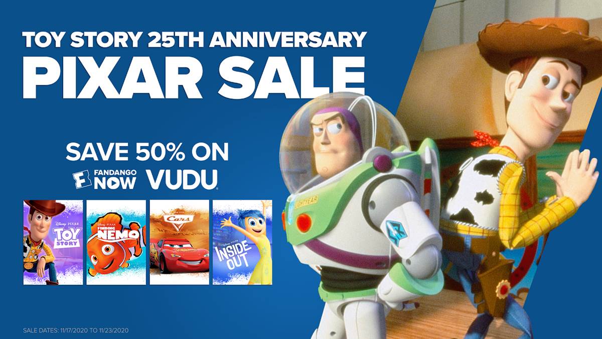 - To celebrate the upcoming Toy Story 25th Anniversary, Fandango is offering a special limited 50% off pricing on more than twenty of Disney and Pixar’s classic movies through its video-on-demand services, Vudu and FandangoNOW. The offer, good through Sunday, November 22, allows fans to add their favorite Disney and Pixar films to their movie collection for only $9.99 each.