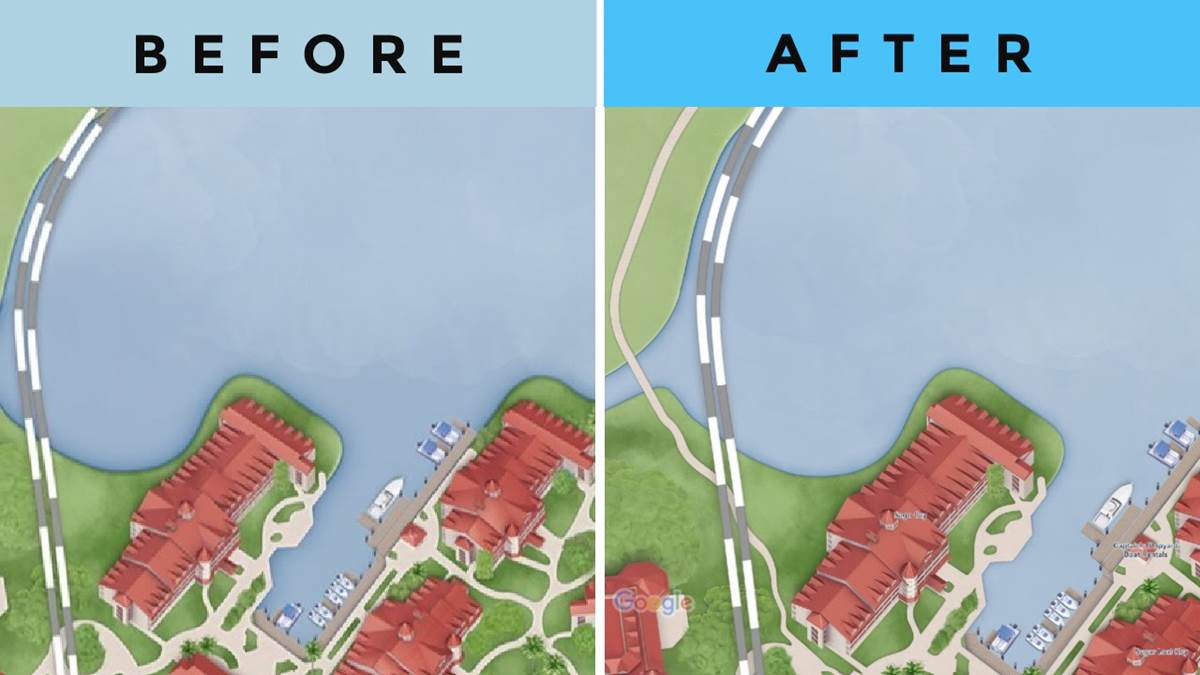 Our last before and after shows the end of the walkway on the Grand Floridian side. You can see that it crosses under the Monorail track to connect Guests near the marina at that resort.