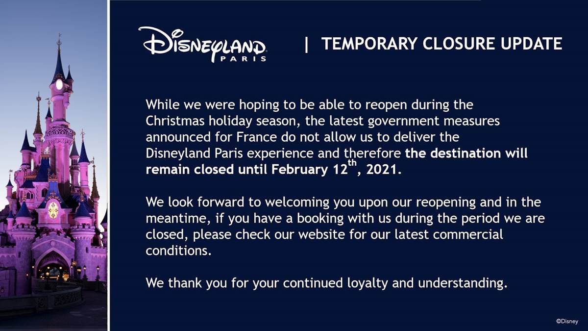 Turns out Disneyland Paris will not be open for the Christmas season. The resort announced today that it will remain closed until February 12, cancelling their plans to briefly reopen for the holiday.