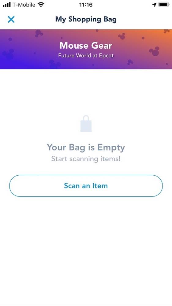 - After selecting Mouse Gear, the guest will be led to their empty shopping bag and prompted to start scanning items.