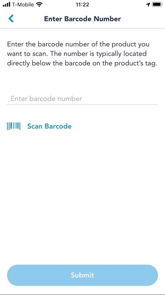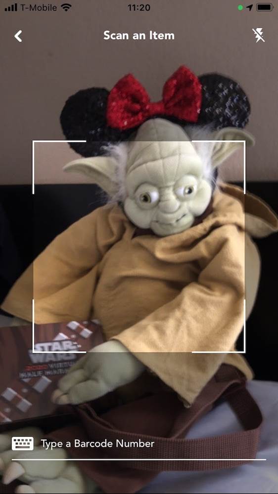 - The scan screen features a square frame for reading the barcode —as showcased by Yoda with his medal and ear headband. If that’s not working, there’s an option to enter the barcode manually on a separate screen.