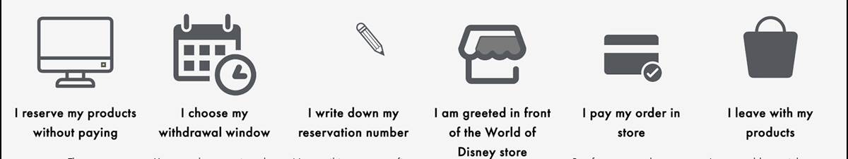 • Guests can book a selection of items on Store.DisneylandParis, then pick up selections at the World of Disney store (Disney Village) at the indicated timeslot.