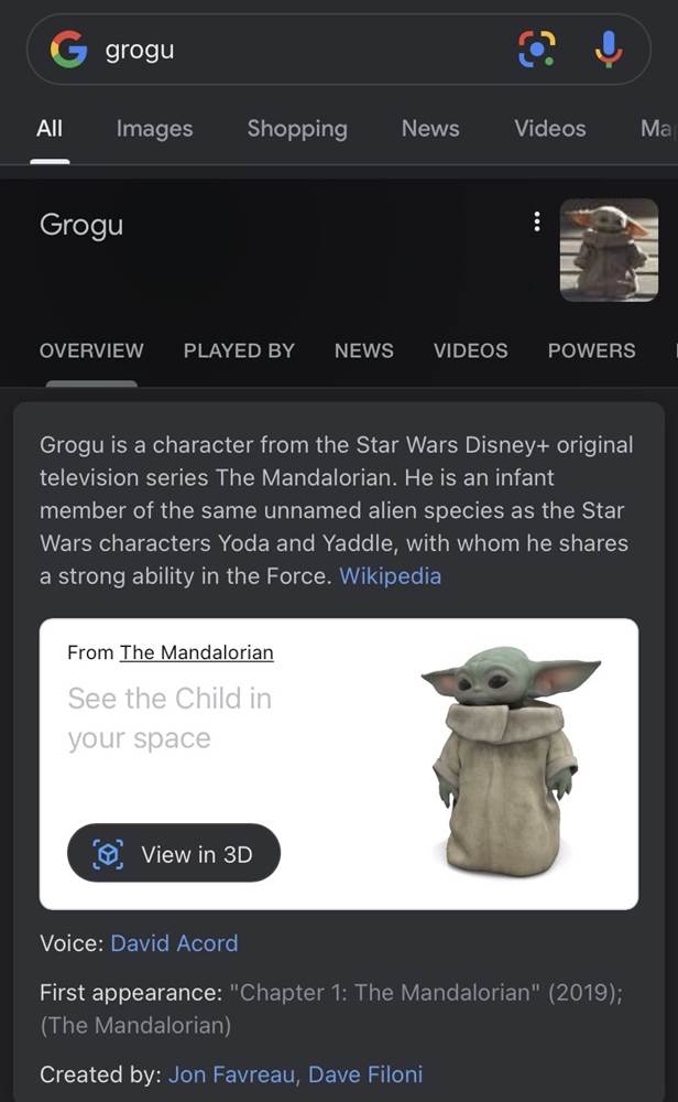 Google has been creating various objects for 3D augmented reality and this may be the most important one yet as Grogu from The Mandalorian has been added to the list.