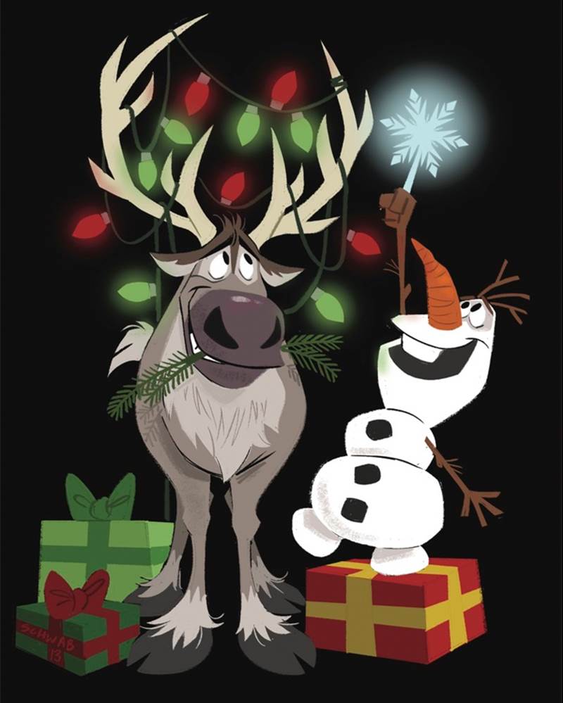 Sort of like Baymax in Jin Kim’s card, Sven has become a tree to decorate for Olaf. He’s holding pine branches in his mouth with a string of lights in his antlers while Olaf tries to figure out where to place the star. Sven doesn’t seem so sure about this. Bill Schwab is an art director and character designer who’s Disney work includes Tangled, Prep & Landing, Frozen, Zootopia, Moana and Frozen 2.