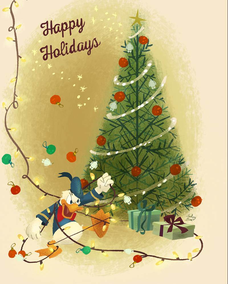 Nothing ever seems to go right for Donald Duck and that’s certainly the case for him here as he tries to string lights and ornaments on a Christmas tree. If you look closely, the white ornaments are actually Baymax from Big Hero 6! Lorelay Bové is a Visual Development Artist who has worked on such projects as The Princess and the Frog, Prep and Landing, Wreck-It Ralph, Big Hero 6 and Zootopia.