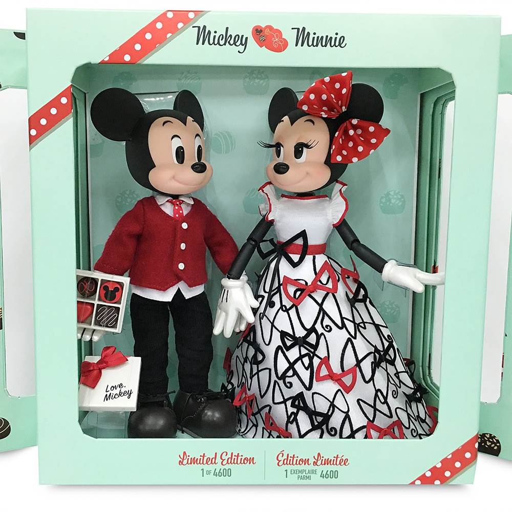 - The ever-romantic Mickey has a lovely box of chocolates for his sweetheart Minnie on Valentine’s Day. This special limited-edition doll set features the couple in elegant attire and is presented in a display case with hinged front panels decorated with confectionary.
