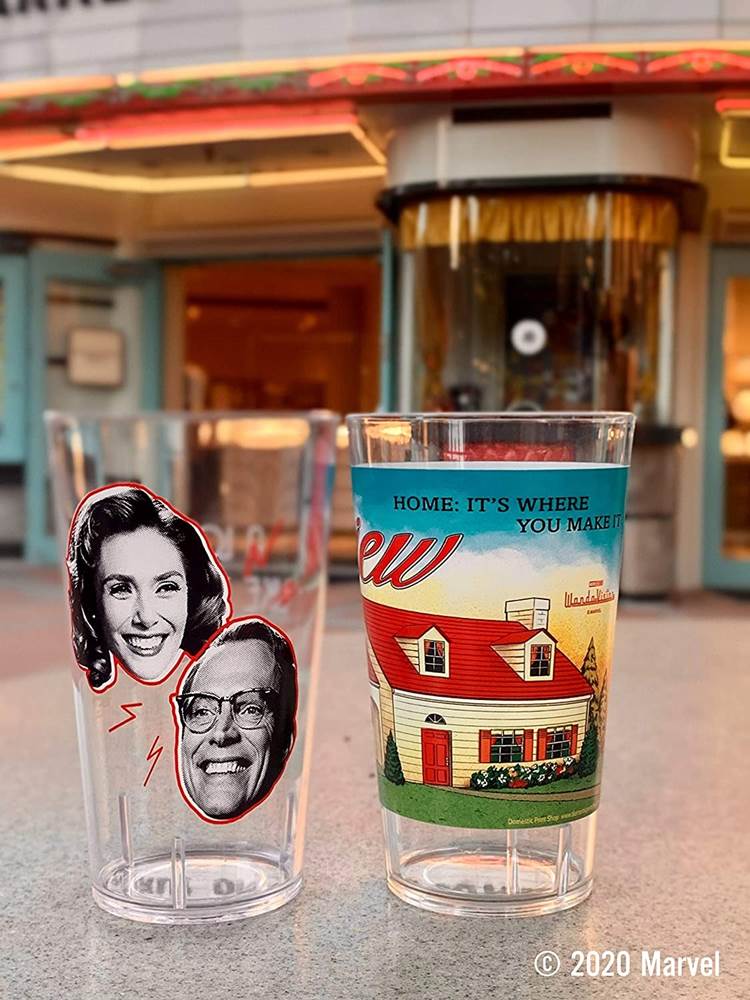 - One cup features the faces of both Wanda and Vision in their classic sitcom forms while the other features “Welcome to Westview” art, showcasing the fictional hometown of the two characters in WandaVision.