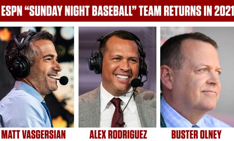 ESPN has announced the Sunday Night Baseball team for the 2021 season — Alex Rodriguez, Matt Vasgersian, and Buster Olney, all returning for the second season together as a trio.