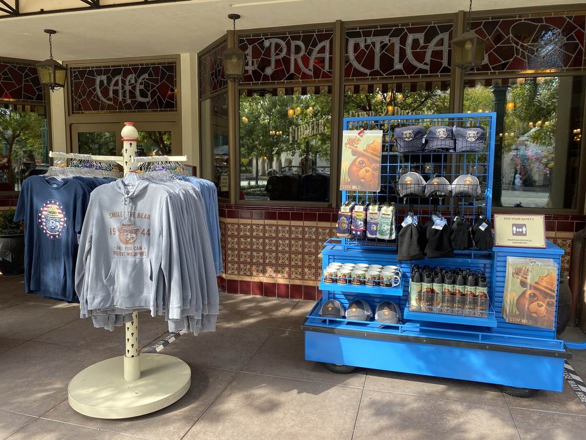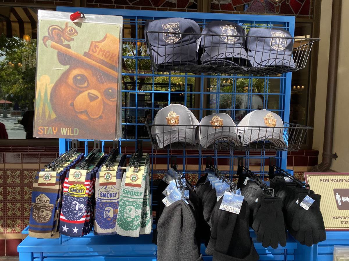 Outside of the Fiddler, Fifer, and Practical Cafe (Starbucks), a lot of Smokey the Bear merchandise has been staged at a kiosk outside. It was slightly jarring to see this merchandise here on Buena Vista Street, but makes some sense as Humphrey’s and Rushin’ River Outfitters in the Grizzly Peak area of the park are still closed, where we would likely find these goods under normal circumstances.