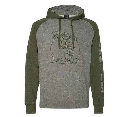 This hooded sweatshirt features the museum’s exclusive insignia design of Donald Duck clad in pilot gear, holding onto the wings of a Consolidated PBY Catalina flying boat printed on gunmetal grey with contrasting army green sleeves and hood features. This boat was commonly seen in the San Francisco Bay during World War II.