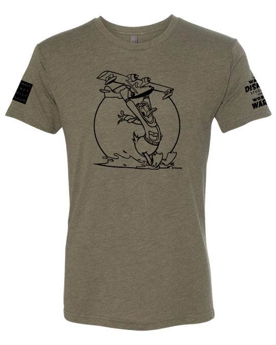 This shirt features the museum’s exclusive insignia design of Donald Duck clad in pilot gear, holding onto the wings of a Consolidated PBY Catalina flying boat printed on an army green t-shirt. This boat was commonly seen in the San Francisco Bay during World War II. Each sleeve has the museum logo on one and the exhibition title logo on the opposite.