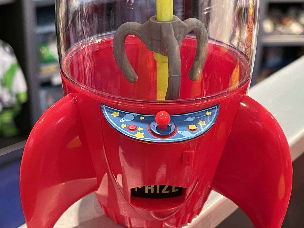 The yellow reusable straw has a plastic claw attached to it, making the decorative interior accent both fun and functional. Other fun details include a three-dimensional joystick and an indented prize dispenser. Sadly, no Little Green Men are included.