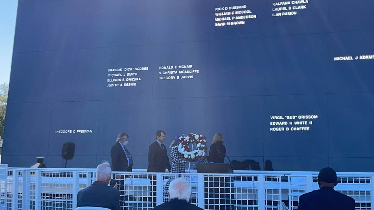 - The bulk of the ceremony took place at the Space Mirror Memorial at the complex. NASA’s fallen heroes are honored at this monument to commemorate astronauts who gave their lives in pursuit of knowledge that lies beyond Earth. Along with the 7 who were aboard the STS-51L Challenger mission, this highly polished black granite is emblazoned with the names of 24 astronauts total, also including the crews of Apollo 1, and STS-107 Columbia. Dedicated in 1991, and created by the Astronauts Memorial Foundation, the Space Mirror Memorial is designated as a national memorial on the National Register of Historic Places. Constantly illuminated, the astronaut names on this memorial are a simple reminder that space exploration can require the ultimate sacrifice.